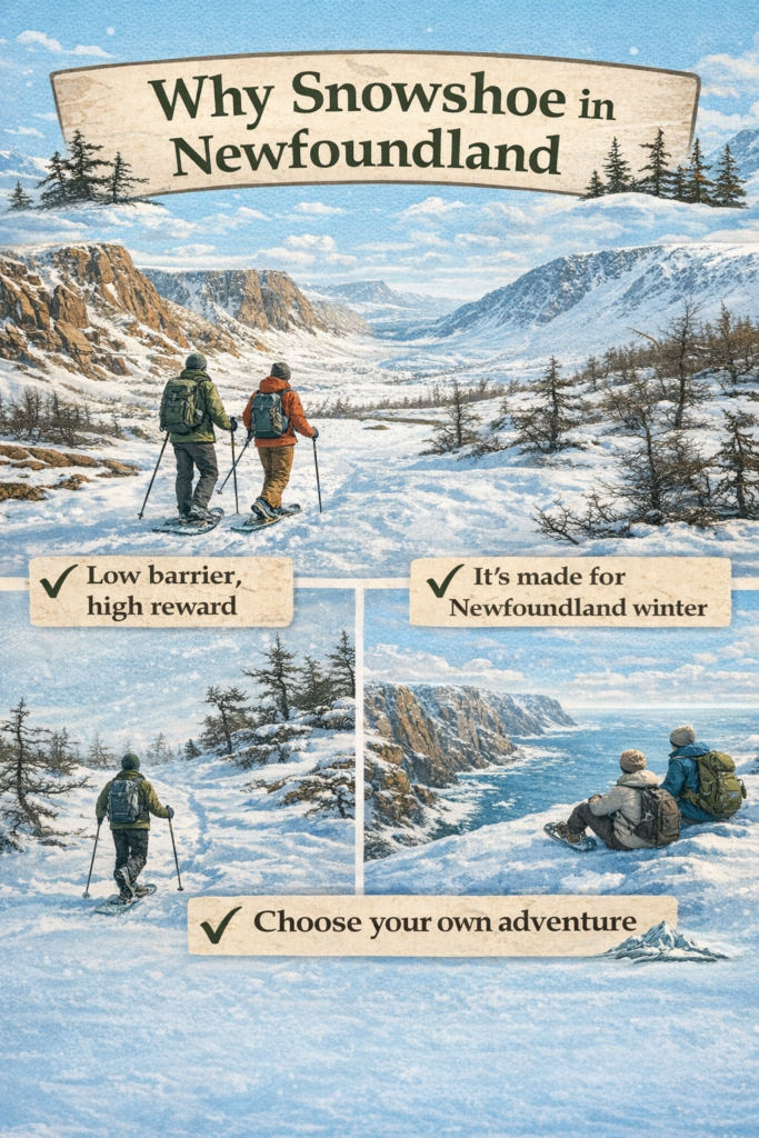 Snowshoeing here is next-level scenic. Start with Parks Canada’s guidance first: Snowshoeing in Gros Morne.