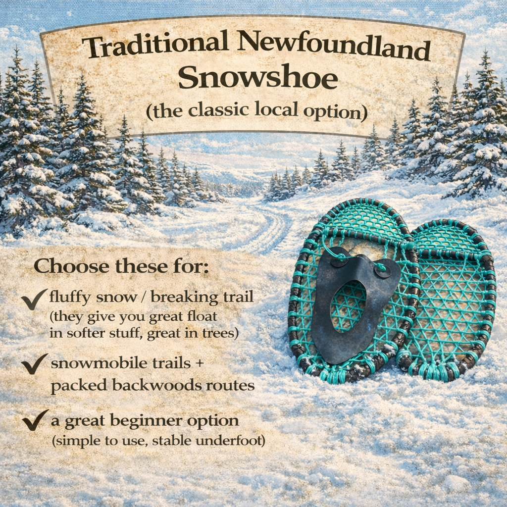 • It’s made for Newfoundland winter. Some days are too snowy for hiking, some days are too icy to feel confident in boots alone… but snowshoes don’t care. They give you grip, they keep you floating on softer snow, and they make winter trails feel doable again. Translation: you can still explore even when the island is being… the island.